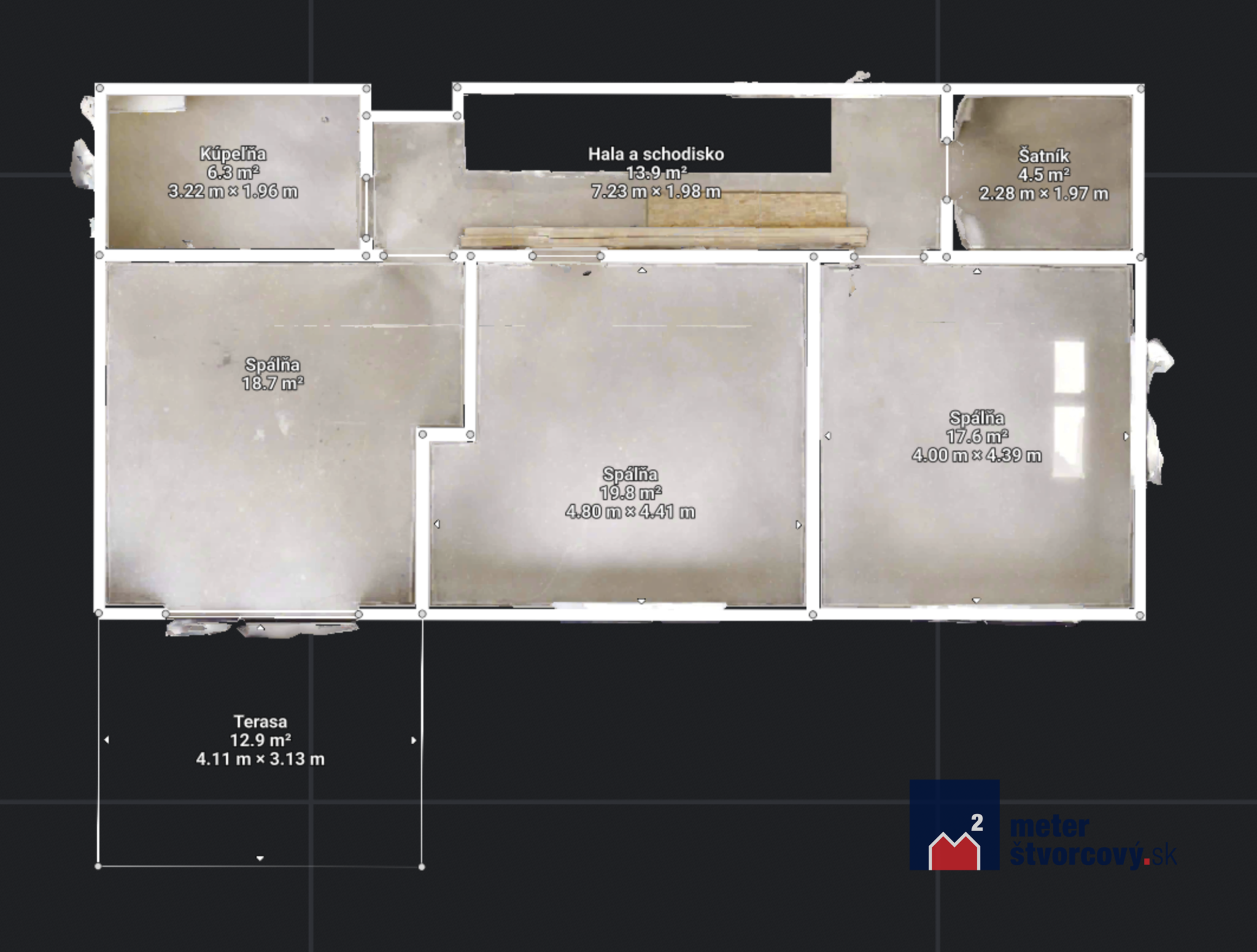 Dispozícia domu je prispôsobená modernému štandardu otvoreného priestoru s ohľadom na oddelenie kľudovej a dennej časti. Na prízemí sa nachádza veľký obývací priestor spojený s kuchynskou časťou a jedna nadštandardne veľká izba, na poschodí nájdete ďalšie 3 spálne, kúpeľňu, šatník a terasu.
