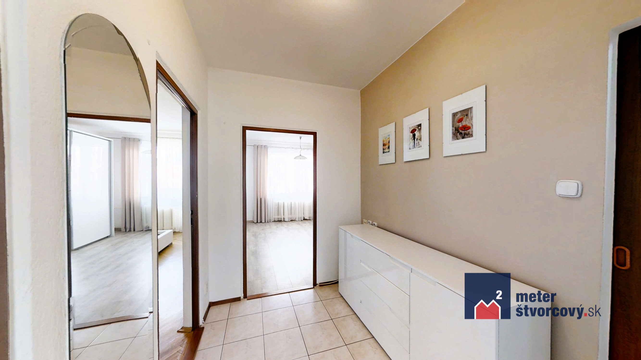 Dispozíciu tvoria: vstupná chodba, priestranná obývacia izba, kuchyňa s východom na balkón, dve samostatné izby (zo spálne je vstup na lodžiu), kúpeľňa a samostatné WC, špajza.