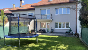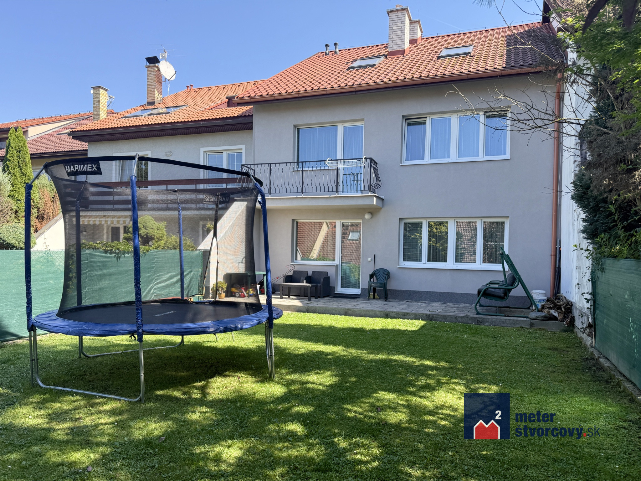 Spodné podlažie má spoločenskú miestnosť, sklady a zázemie a priame prepojenie na záhradu. Rozmery pozemku sú 9x33 m. Záhrada je veľmi prakticky riešená a aj napriek menším rozmerom poskytuje v lete dostatok súkromia a spĺňa všetky potrebné funkcie pre rodinné aktivity.